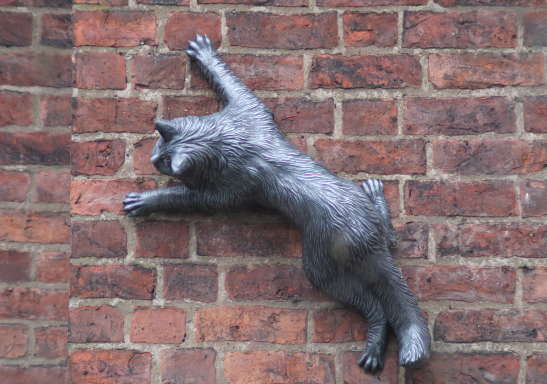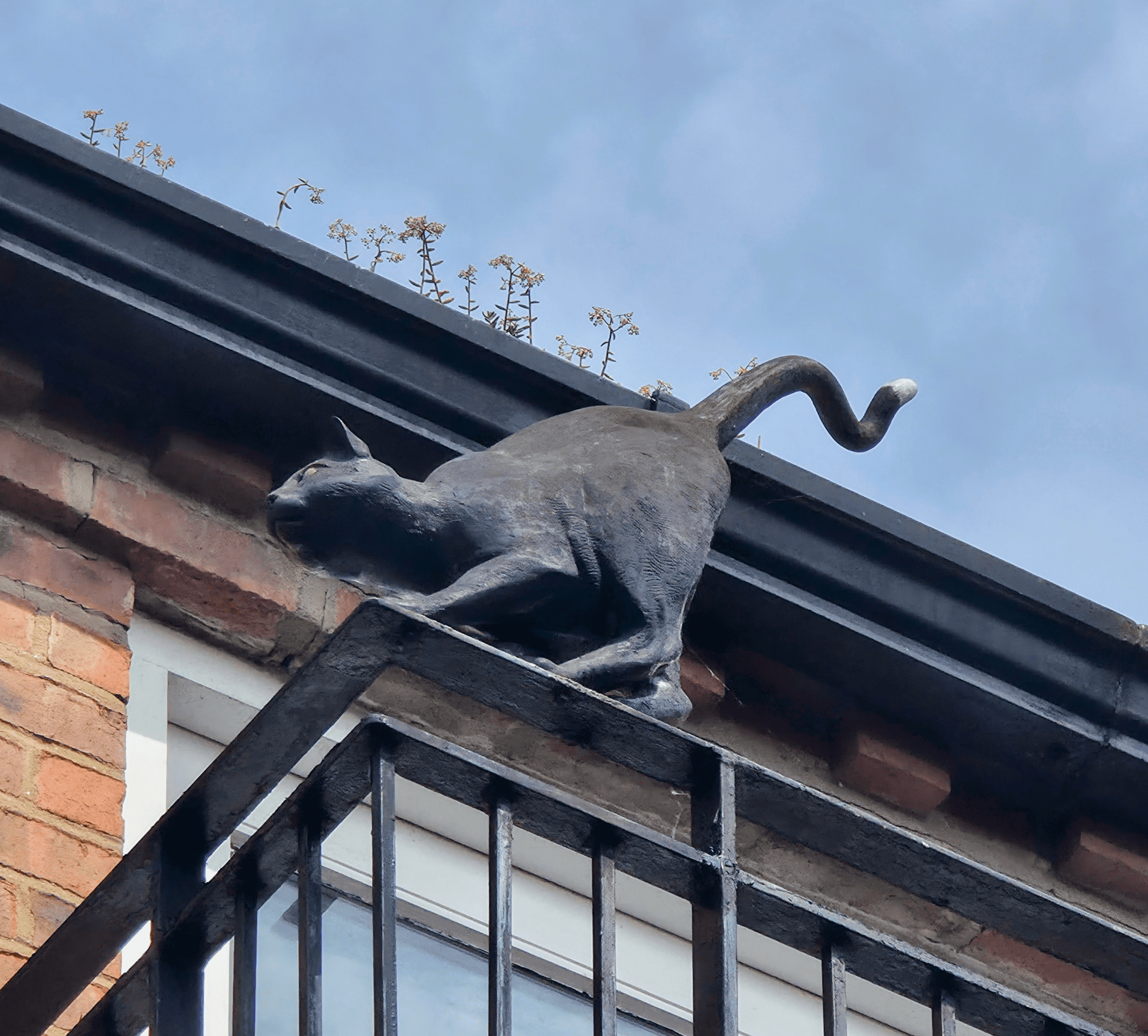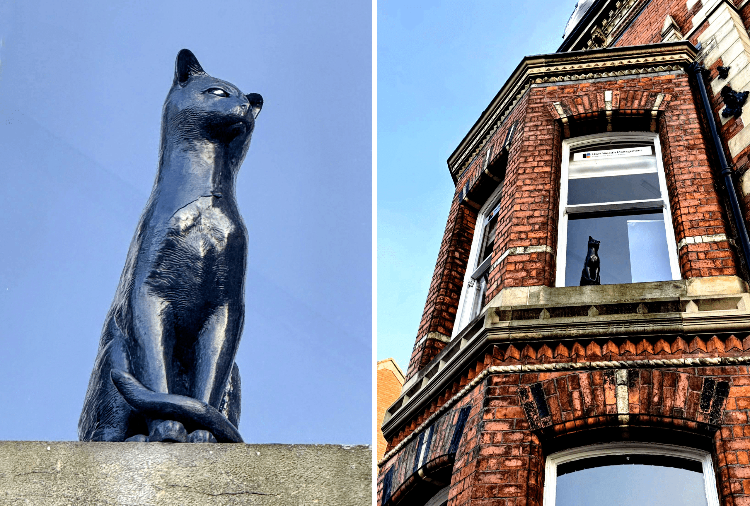 The black resin cat at Chambers on Yorkshire Chambers has watched over the building since the early 1990s. Sculpted by Jonathan Newdick, this poised feline carries an almost professional air.