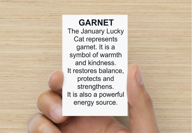 The January Good Fortune Feline represents garnet, and is a symbol of warmth and kindness.