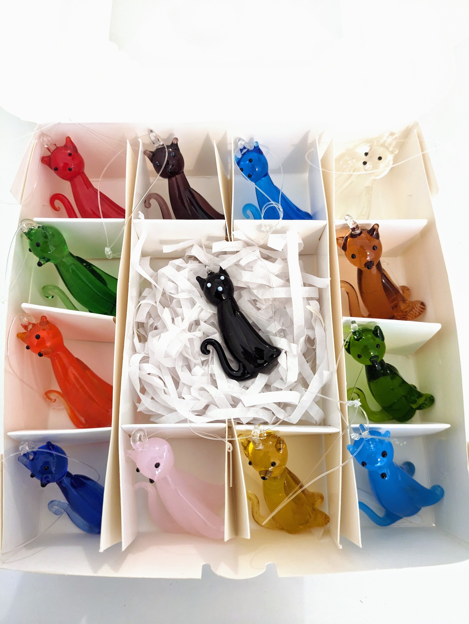 Set of 13 York Lucky Cats for Christmas Tree. Special edition of 12 gemstone colour York Lucky Cats plus The Original York Lucy Black Cat. You can hang them on the Xmas tree or in the window as a suncatcher.